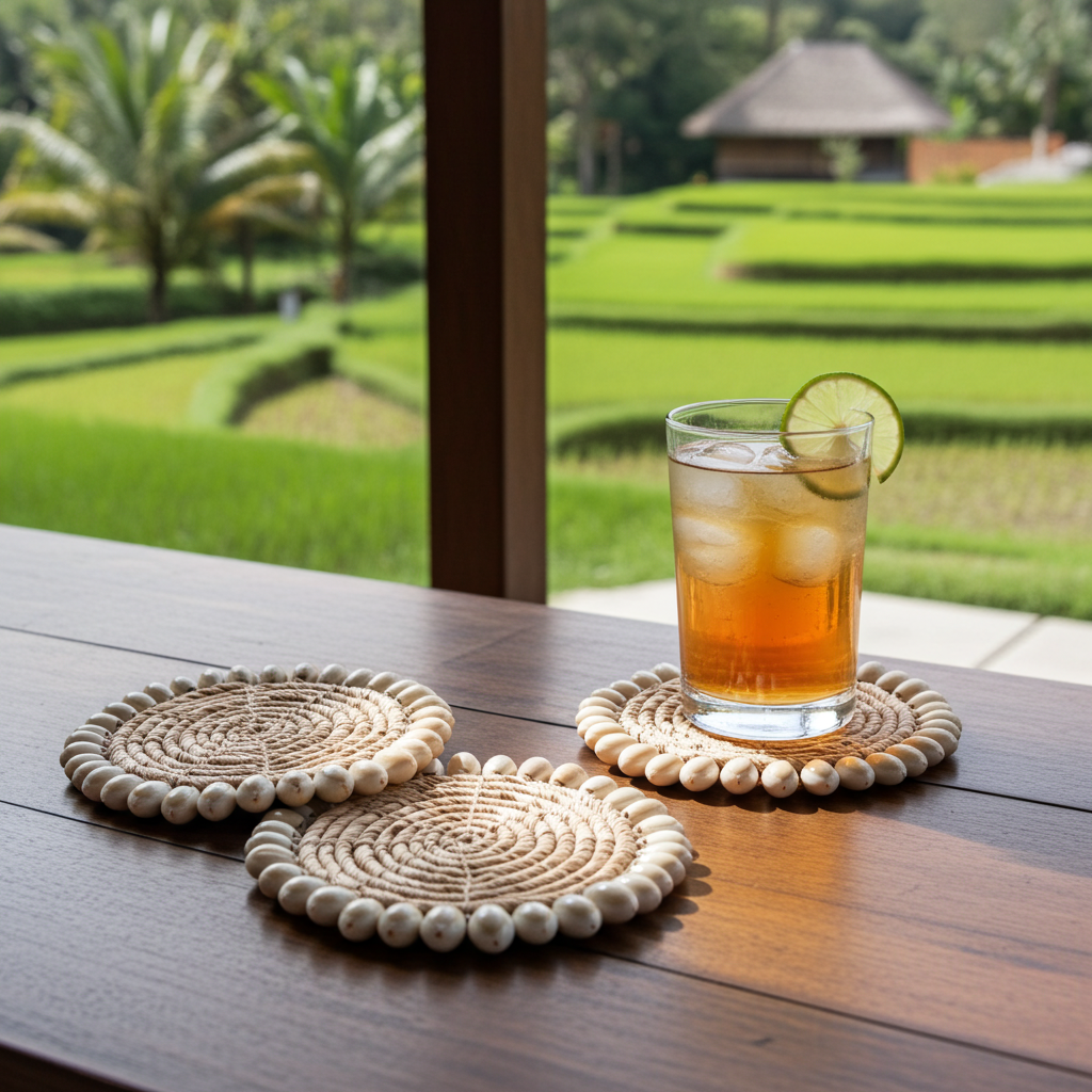 Woven coasters decorated with cowrie shells, made from natural bananleaf. They are a very popular home decor item with a coastal or bohemian style and are handcrafted in Bali.