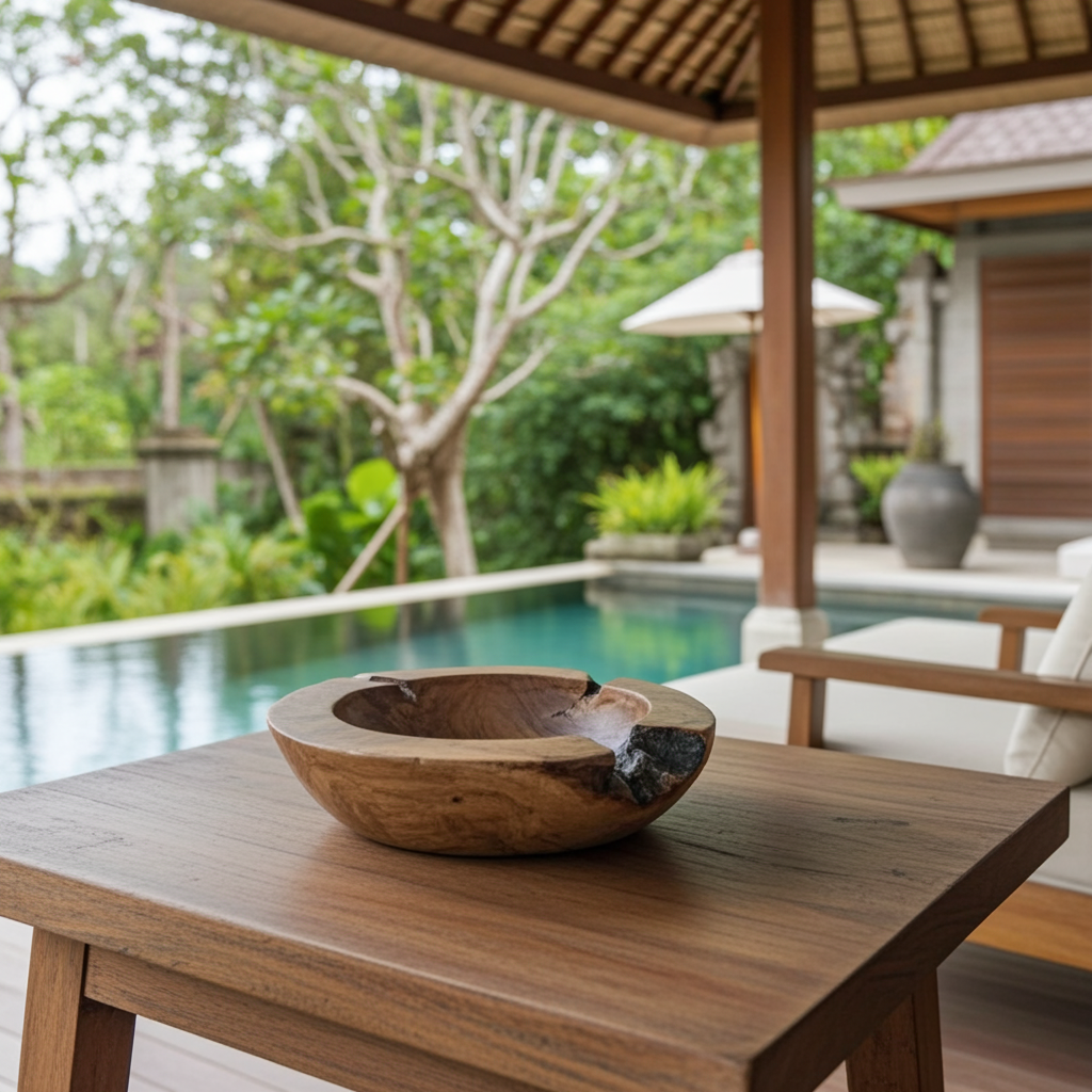 Hand-carved teak wood ashtray featuring natural "live" edges that incorporate the organic shape and bark of the original teak root or trunk