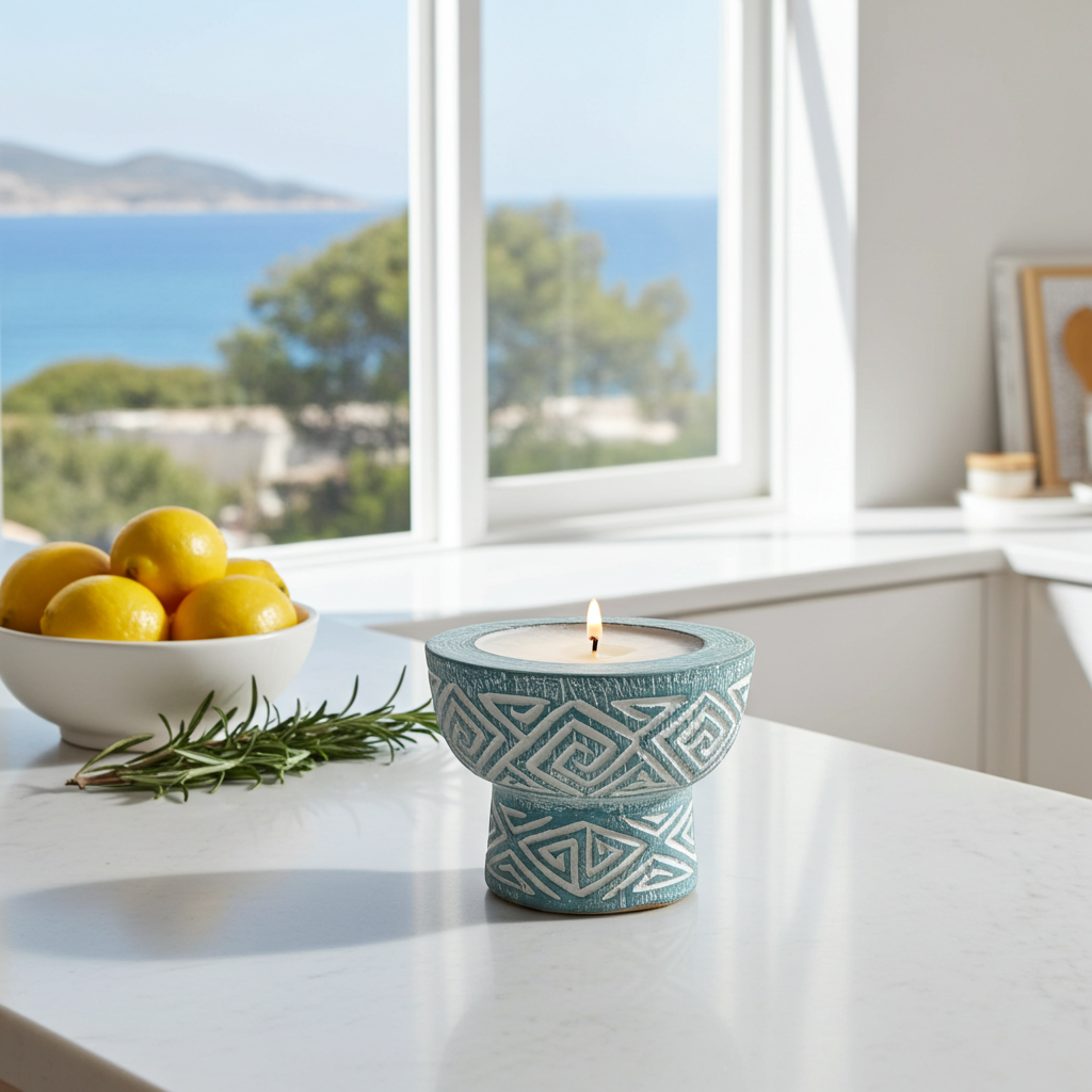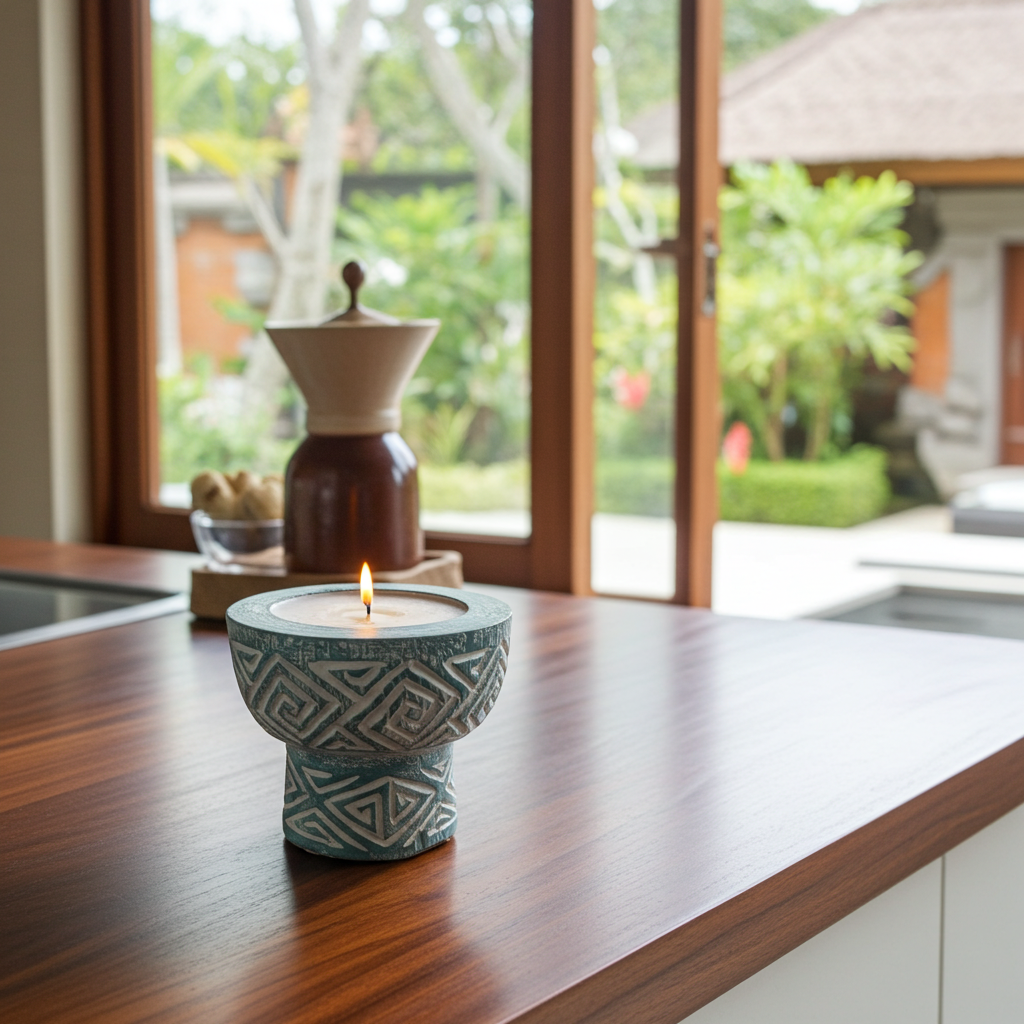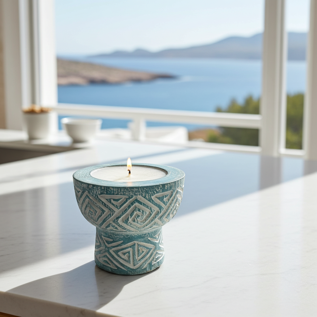 Hand-carved wooden candle hourglass shape in a blue finish.
