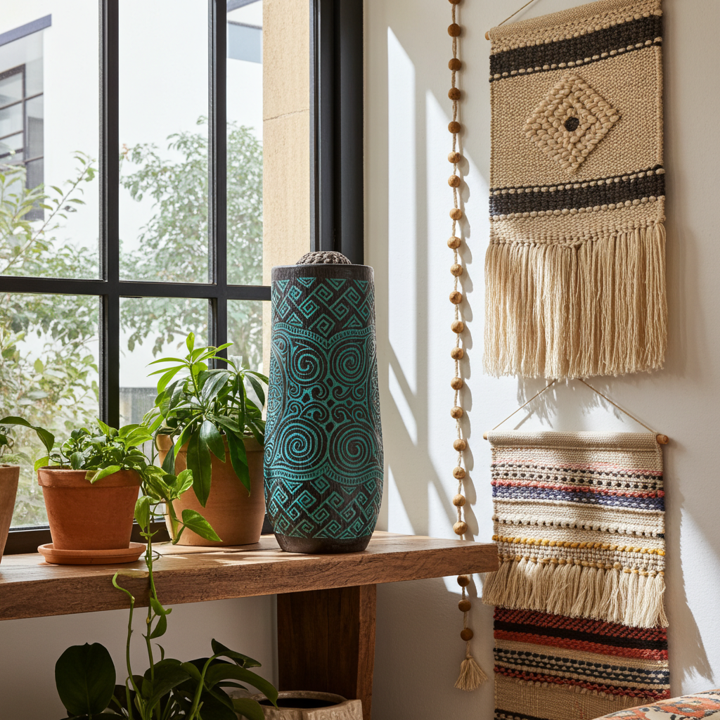 Cylindrical green decorative vase. The vase is handcarved green washed. Model Glempang