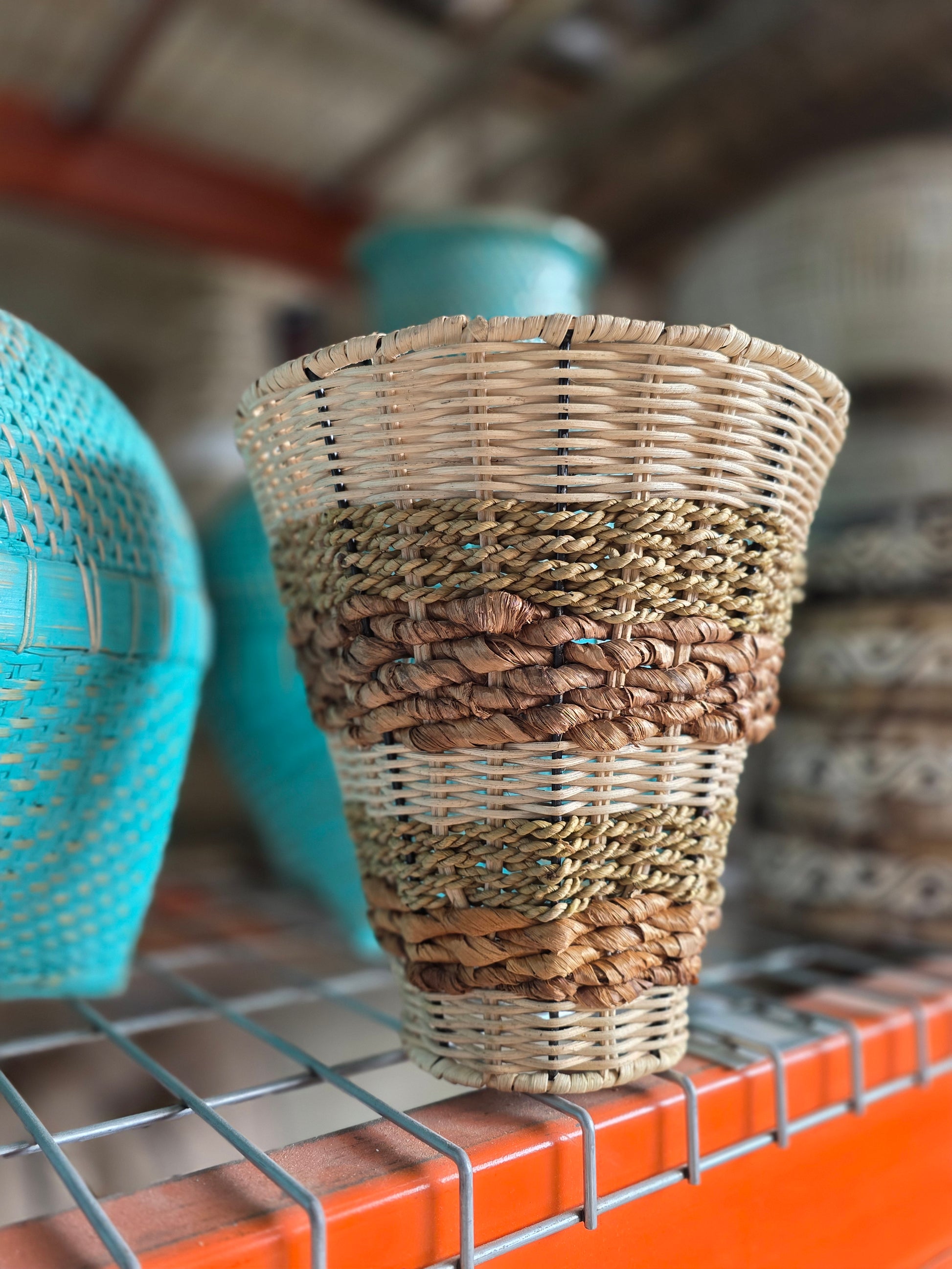 Design: Features a distinctive flared vase shape and a two-part weave: a tighter, finer weave on the upper section and thicker, braided horizontal ropes on the lower section.