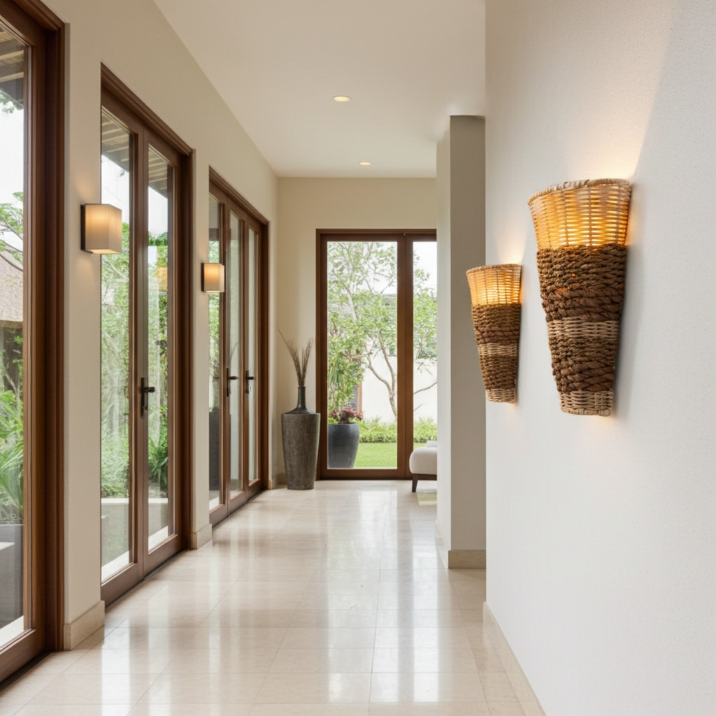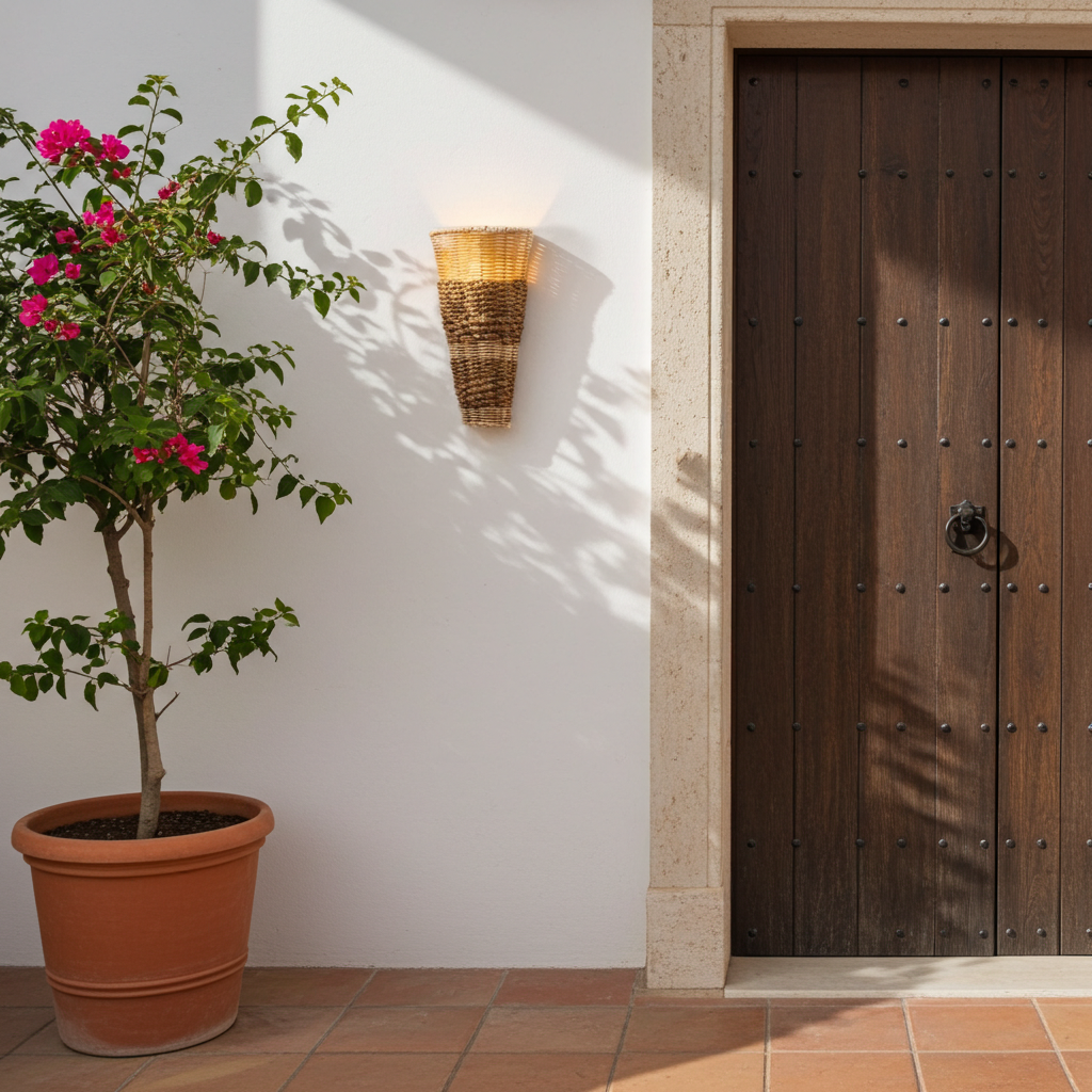 Hand-woven seagrass and hyacinth wall lamp. Model Pinge