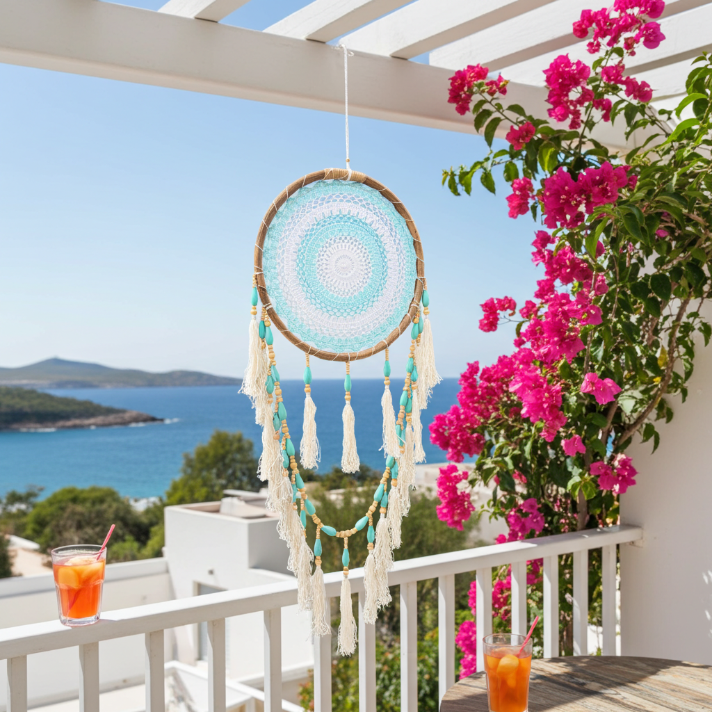 Handmade bohemian-style dreamcatcher. This type of decor brings a natural, beach-inspired aesthetic to a room.