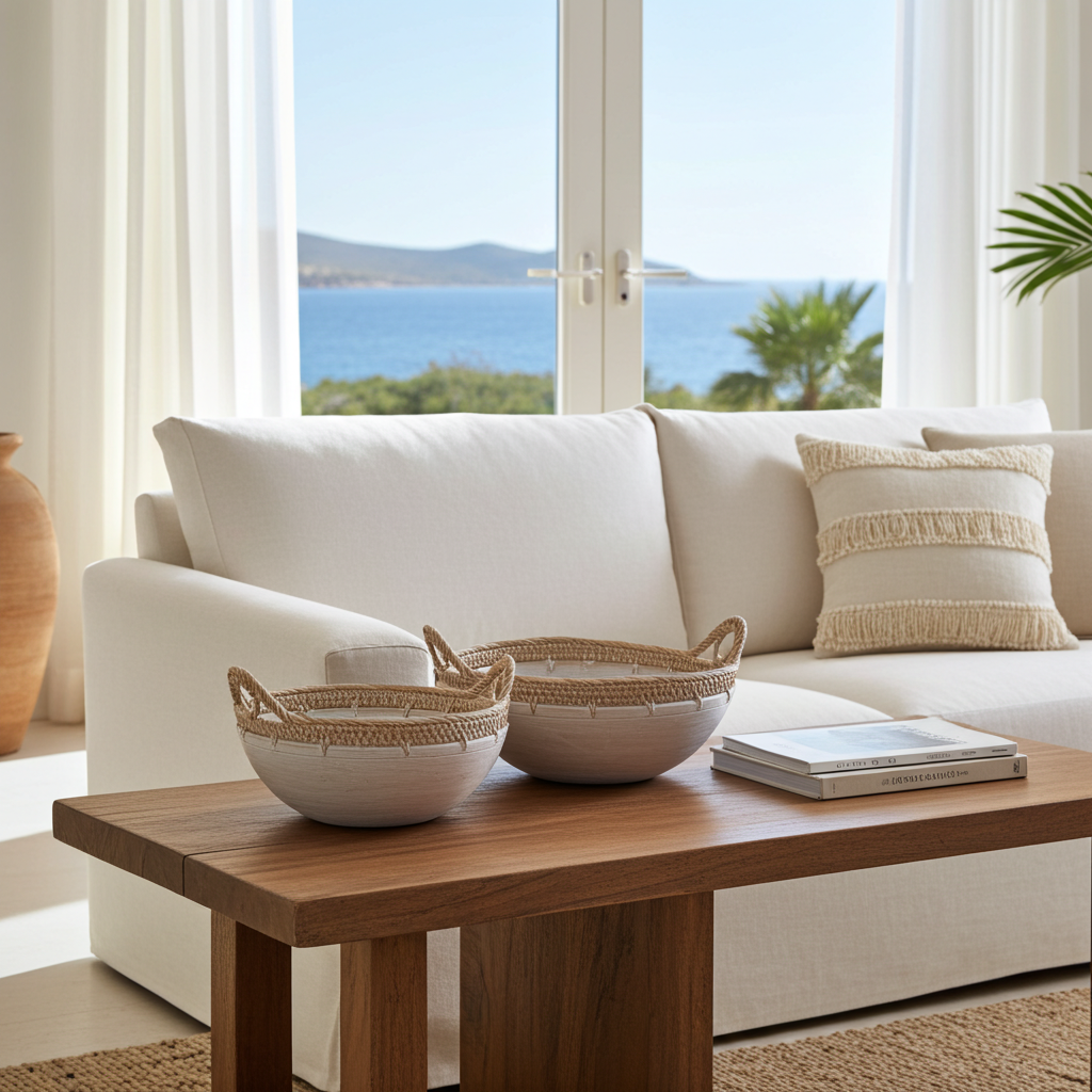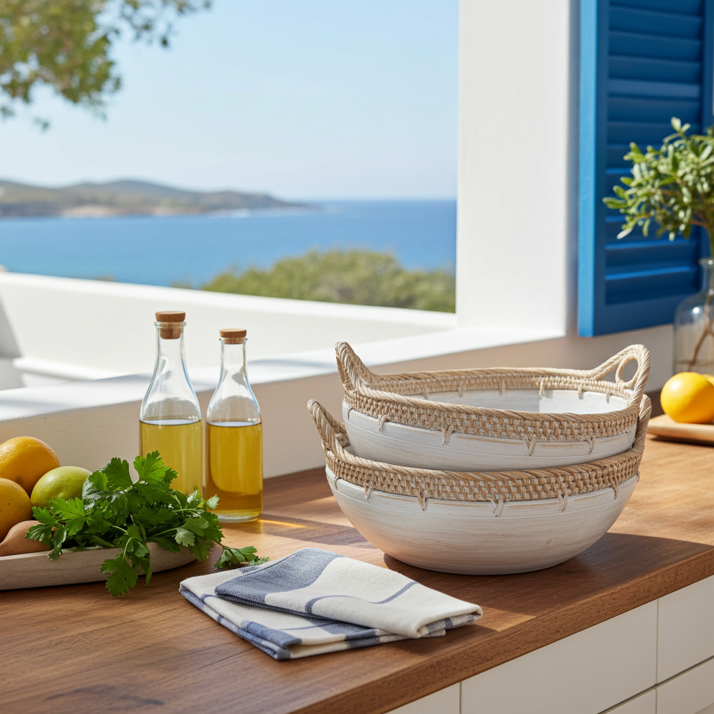 Set of three rattan bamboo bowls. The bowl is whitewashed and comes with two handles. Model Telinga