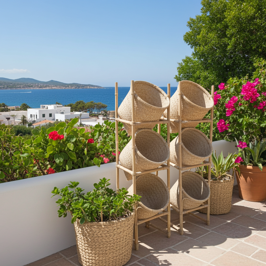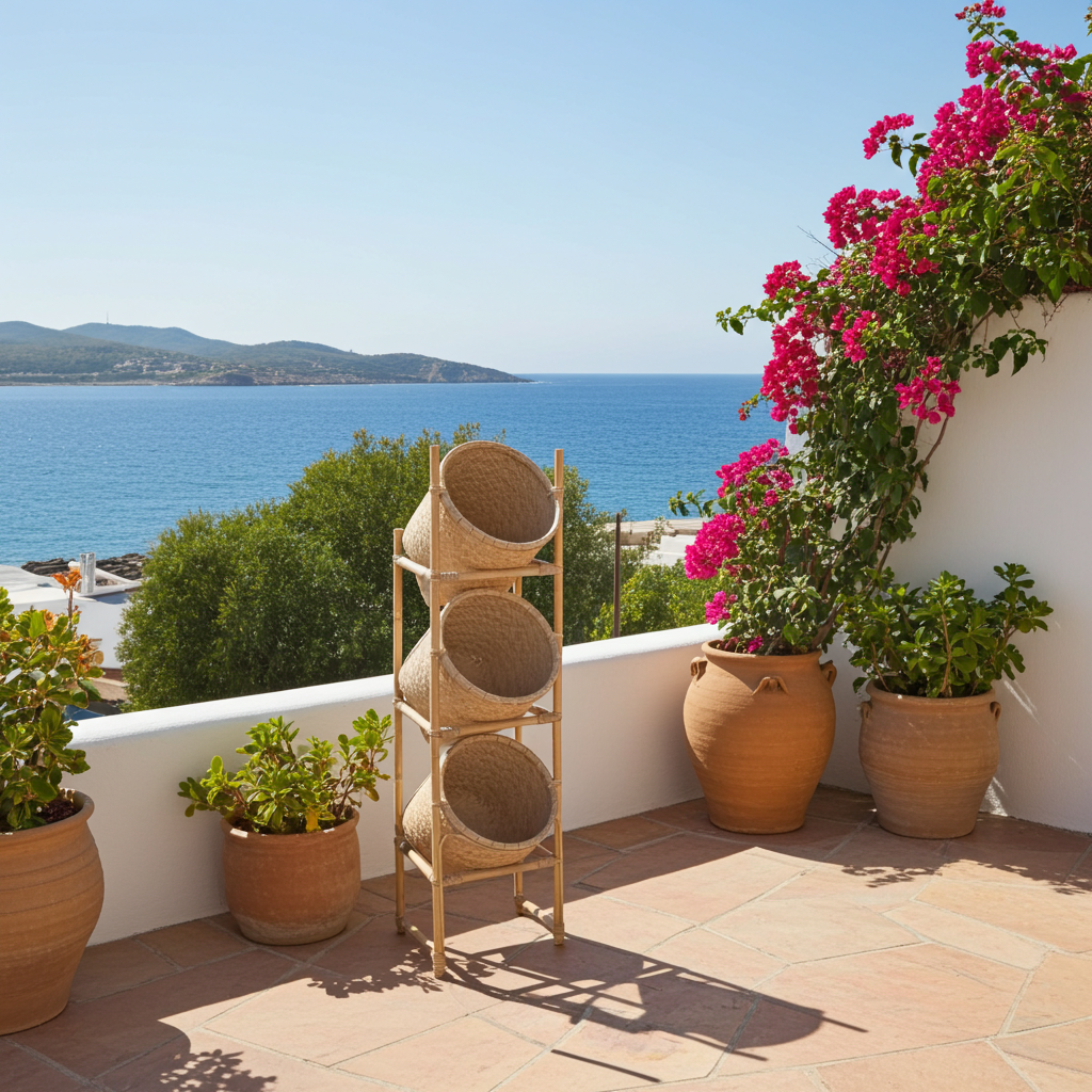 Three whitewashed baskets in a white bamboo tower. Perfect in a bathroom to store your towels and accessories. Model Keranjang
