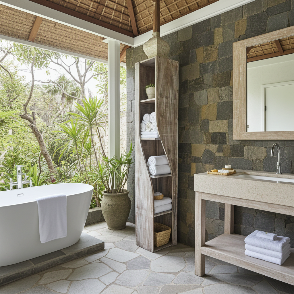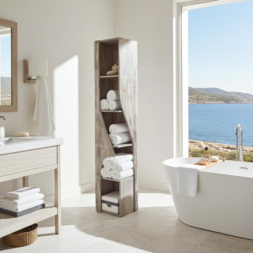 Twisted narrow bookshelf cabinet. The cabinet has a white washed finish.