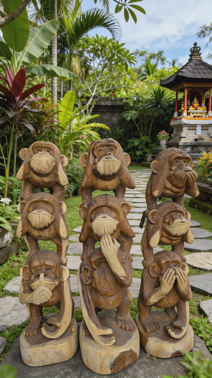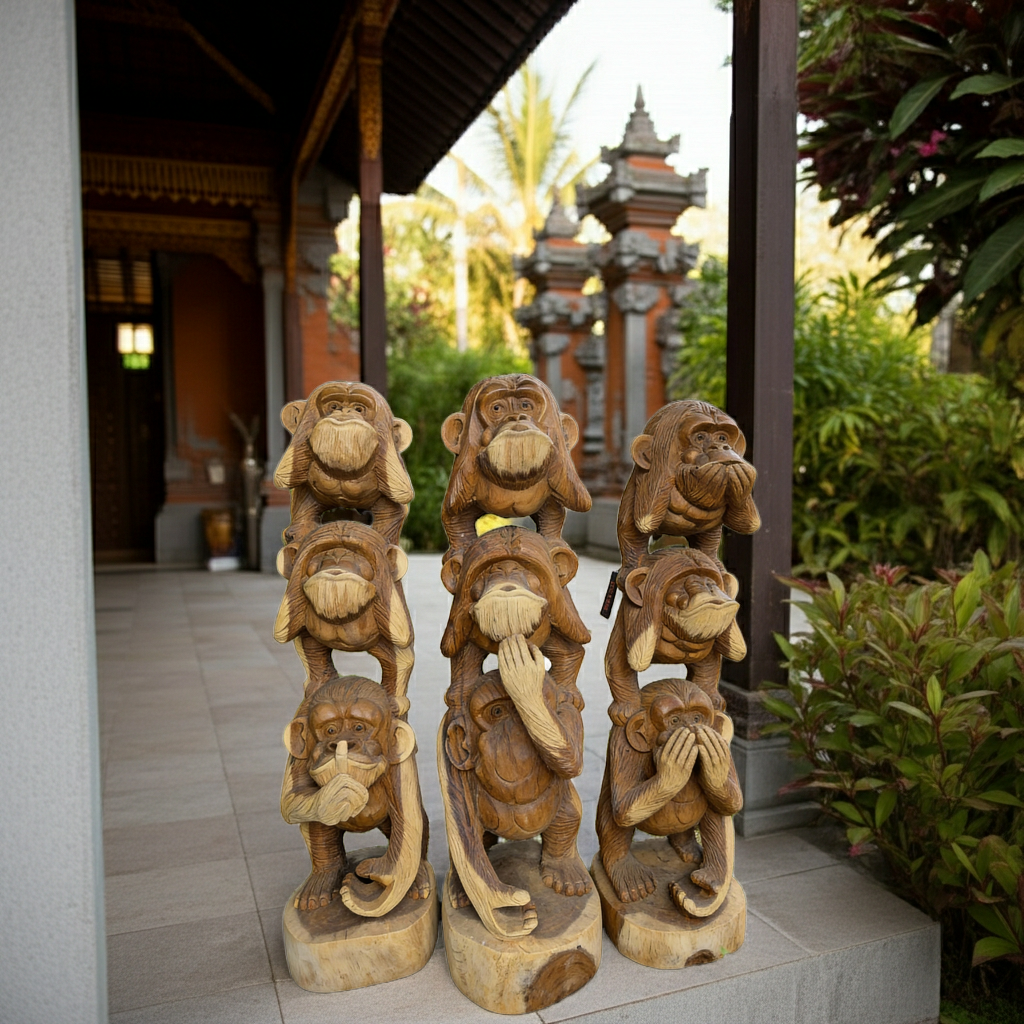 Vertical three monkey statue, see no evil hear no evil. This wooden statue is handcut and made from SUAR wood.