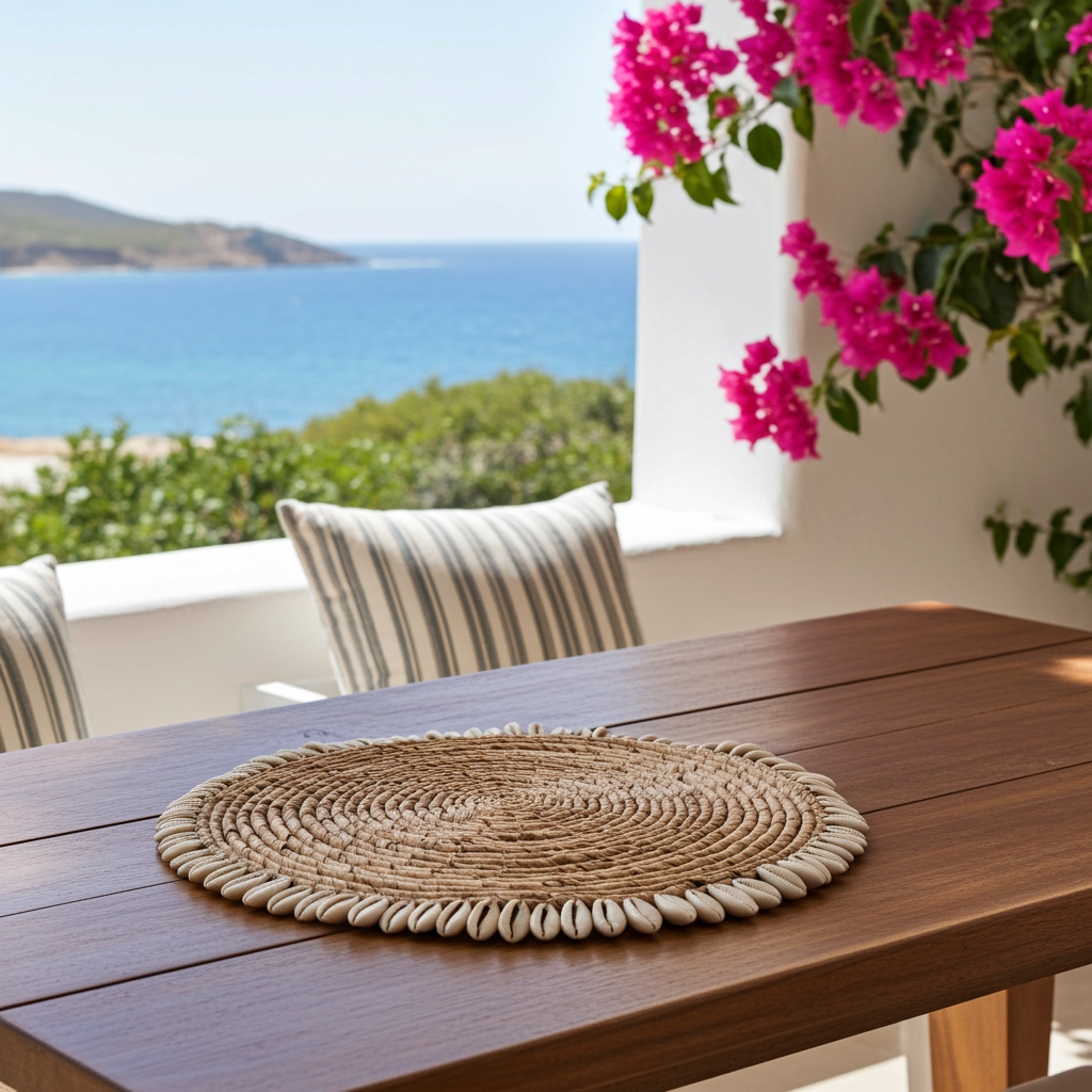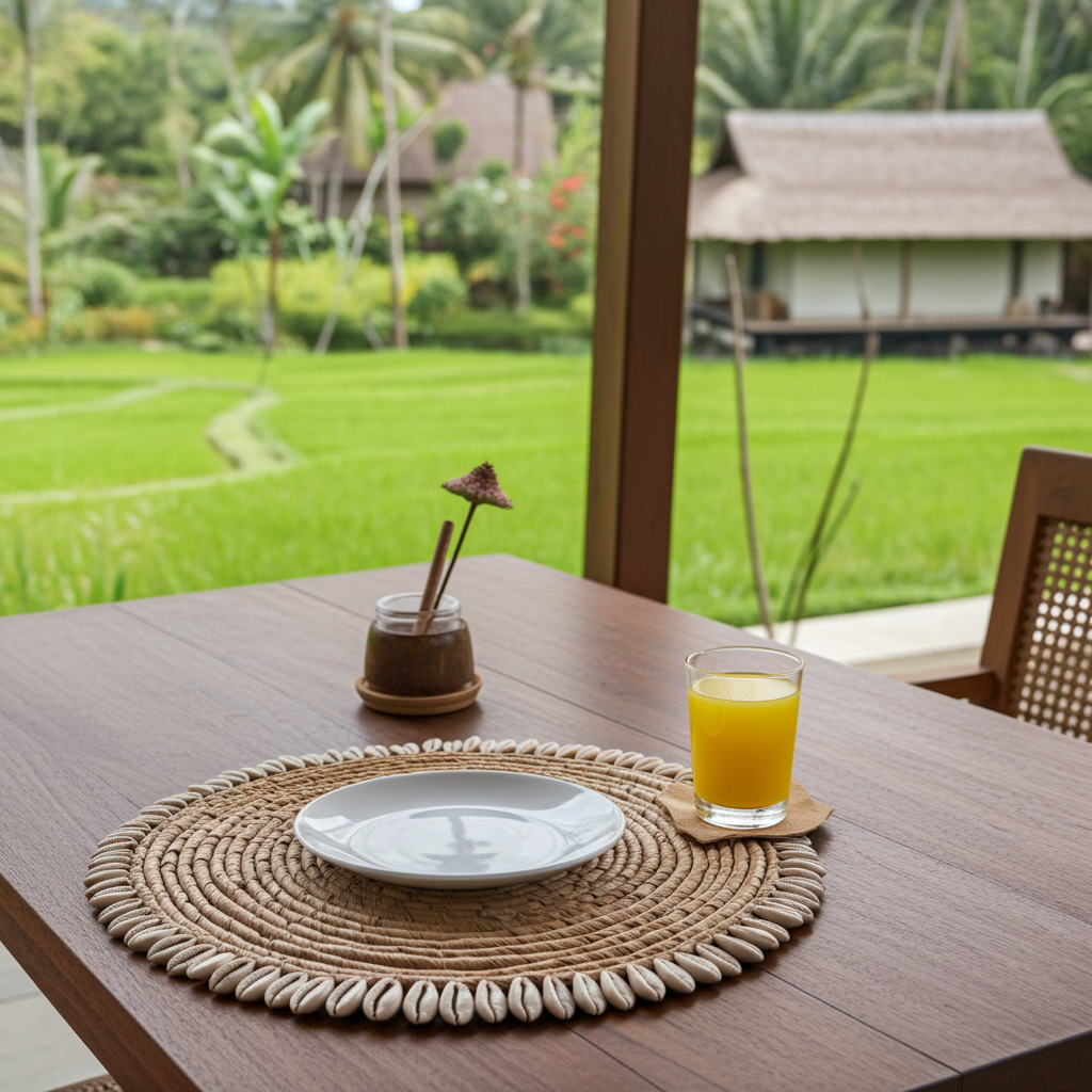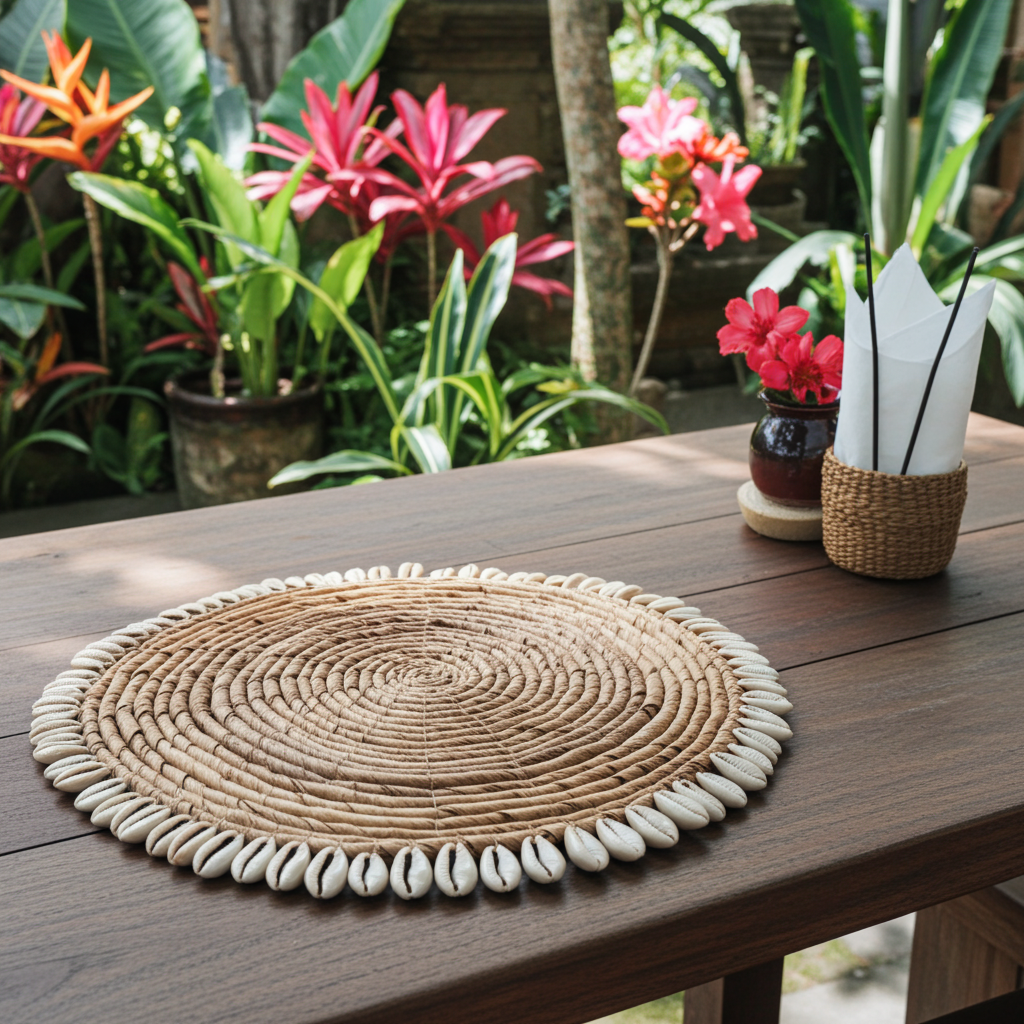 Manteles individuales hechos de hojas de plátano enrolladas y decorados con pequeñas conchas.