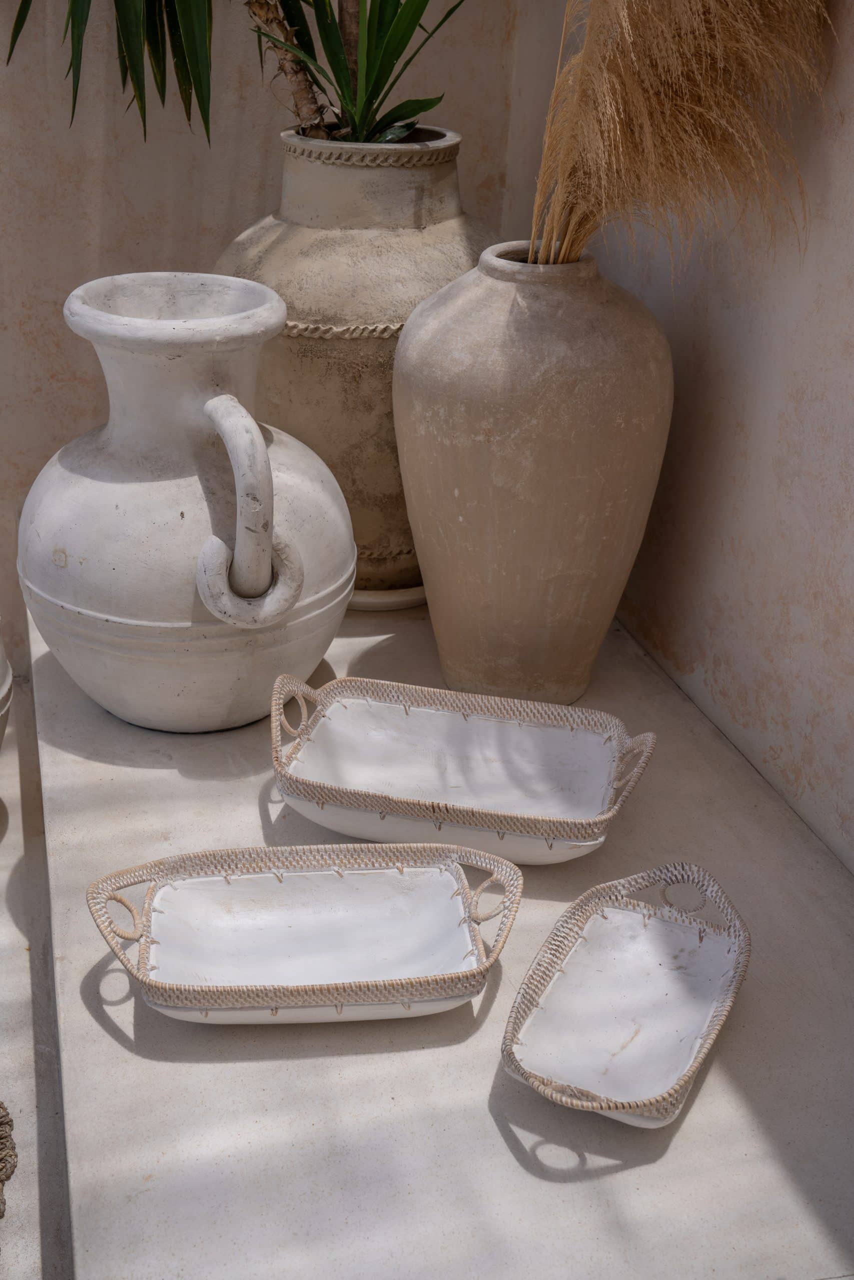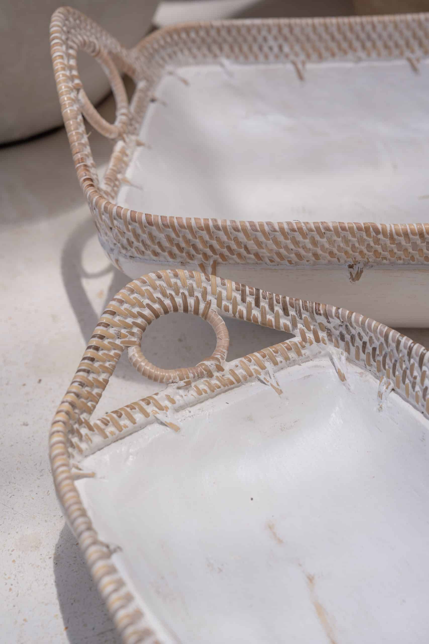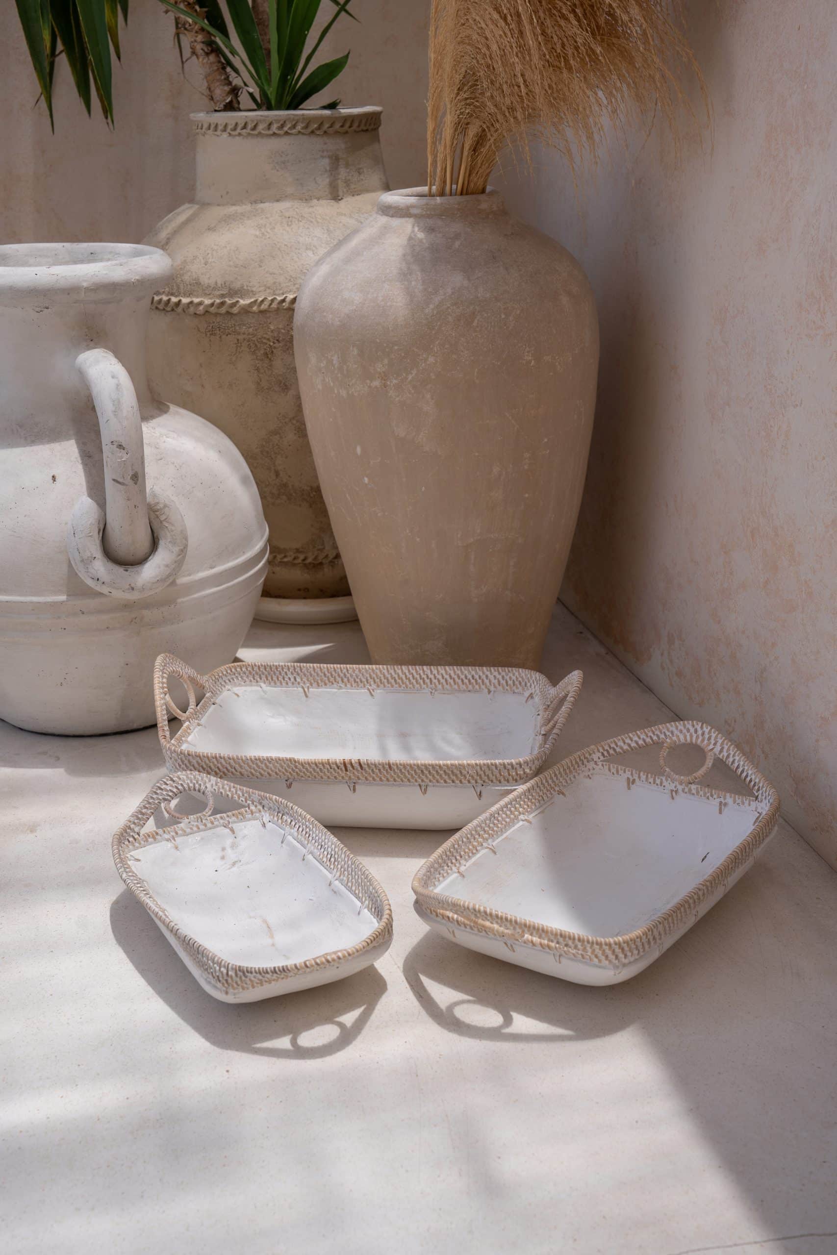 White wooden bowls, set of 3, with sides and grips from rattan. Model Basu.
