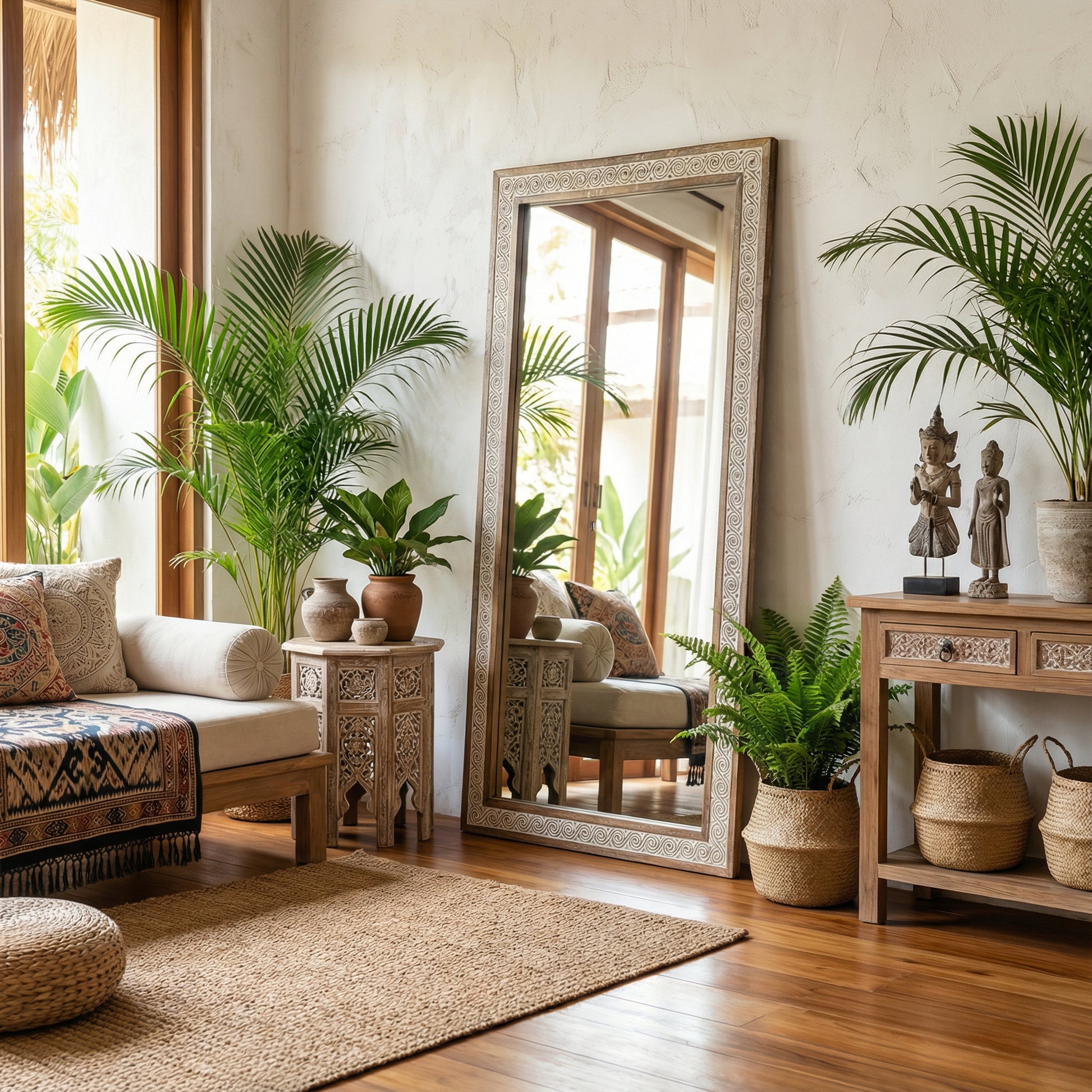 Espelho de pé em madeira esculpida à mão. Modelo Yalimo