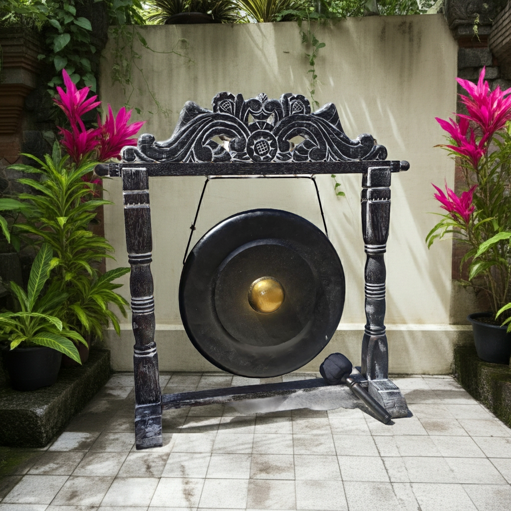 Modelo Gong Logam Zwart. Steun van hout en versierd com handgesneden tekeningen. O Gong é feito de metal e entregue à mão. Todos os gongos foram escritos com Één Hamer.