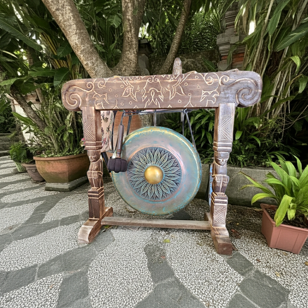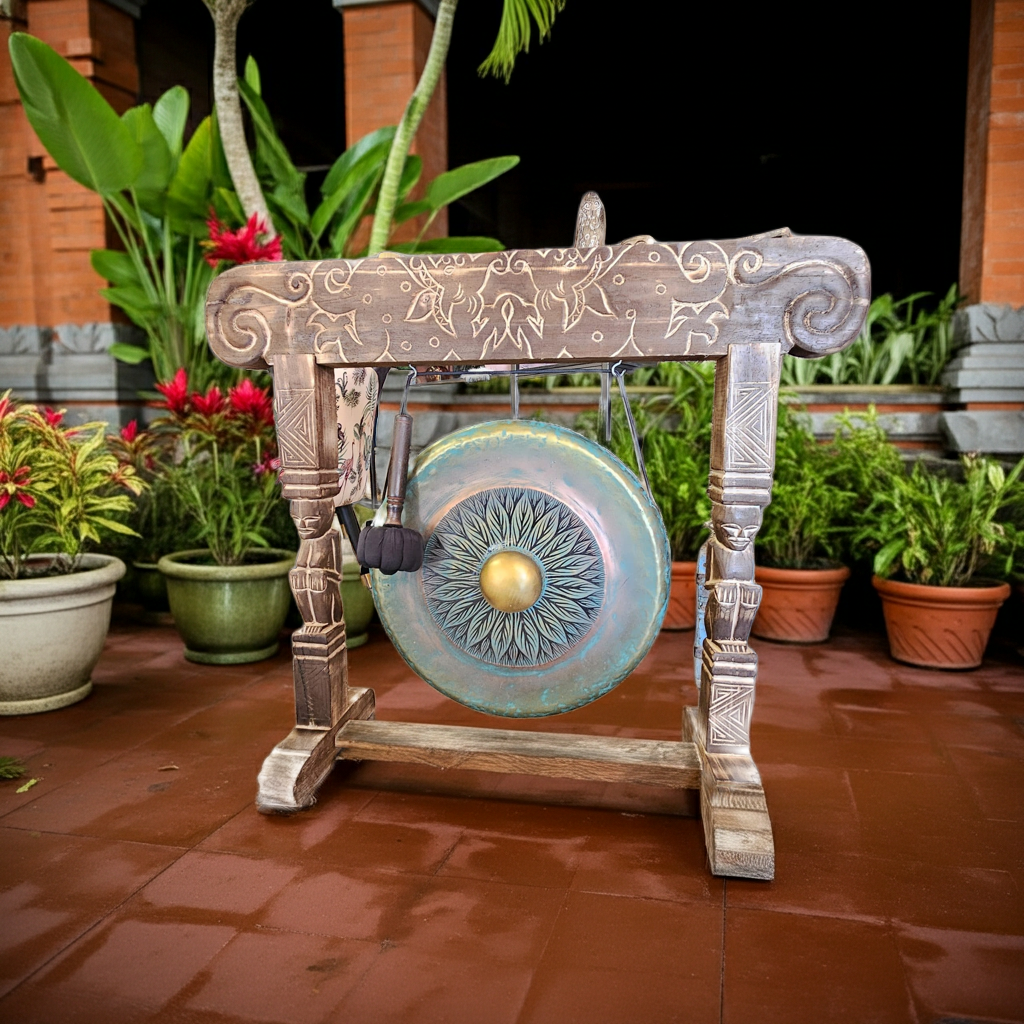 Modelo de flor de gongo Logam. Suporte em madeira decorado com desenhos esculpidos à mão. O gongo é em metal e pintado à mão. Todos os gongos acompanham um martelo.