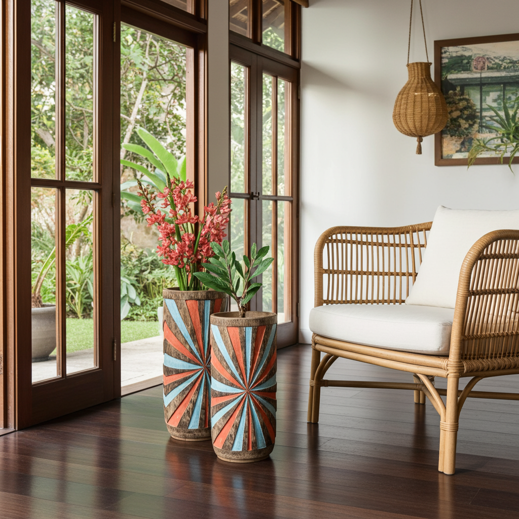 Vaso em madeira esculpido à mão, modelo exclusivo Pelangi, desenhado para a HomeDecoBali , com estética tiki. Possui um padrão radial ou em forma de raio de sol pintado de azul e laranja sobre um acabamento de madeira escura. Oferecemos uma prancha de surf de estilo semelhante na nossa loja.
