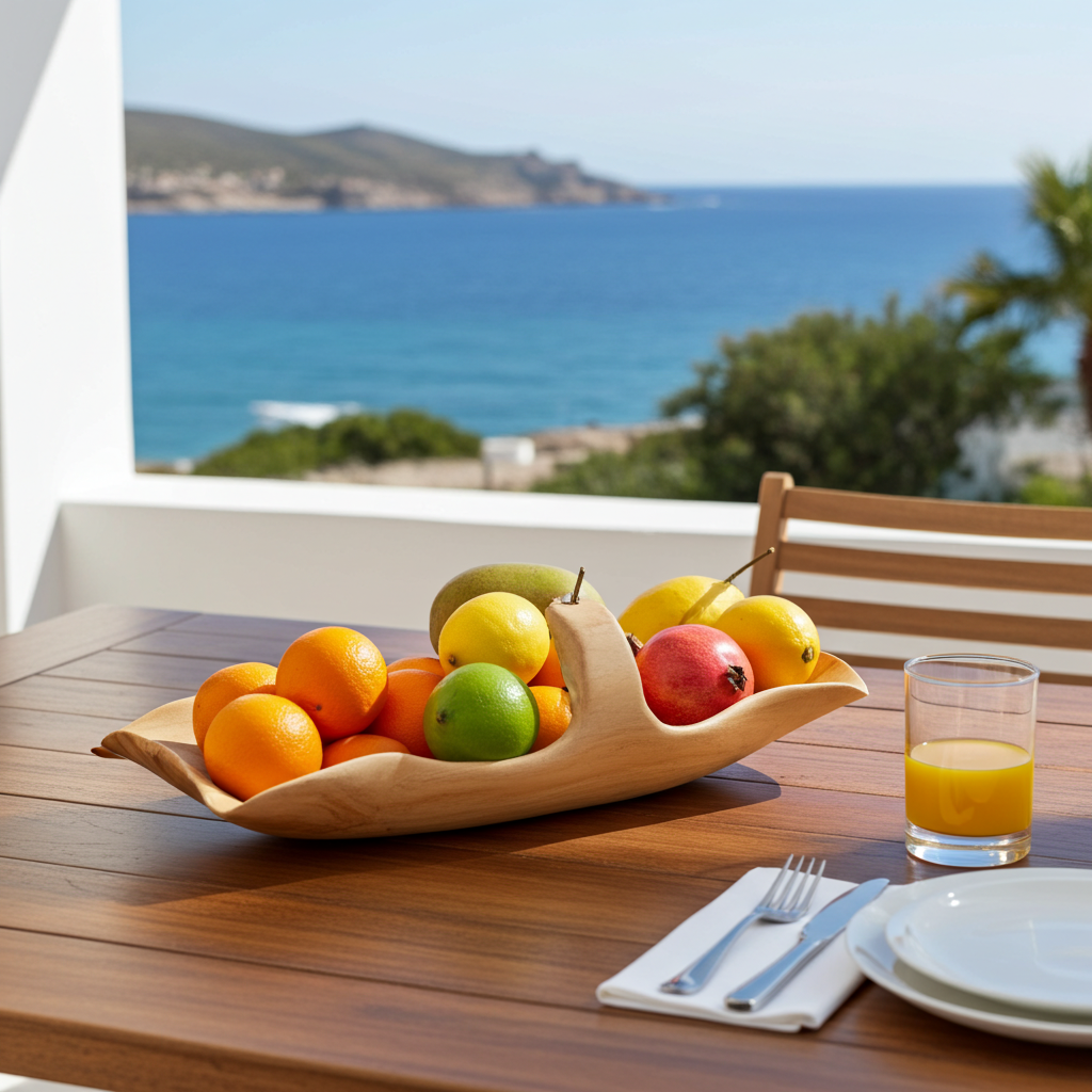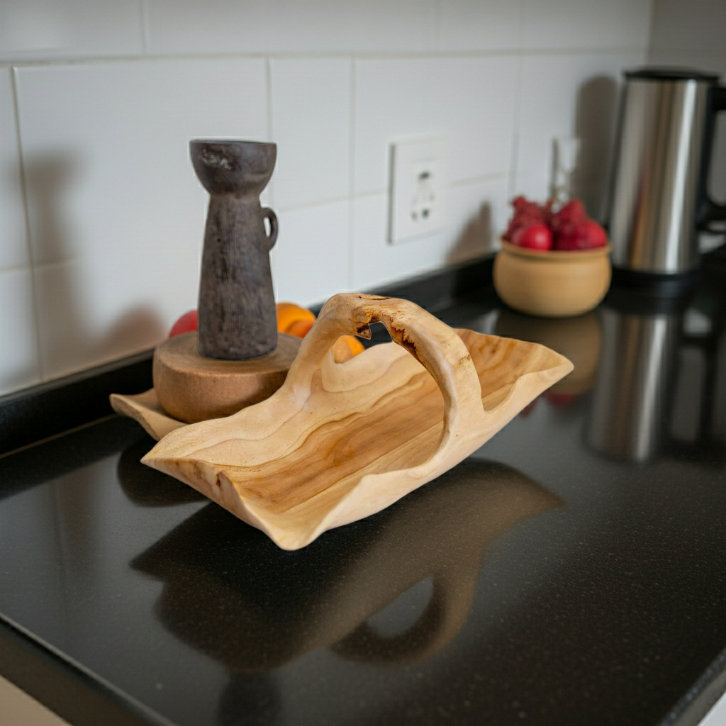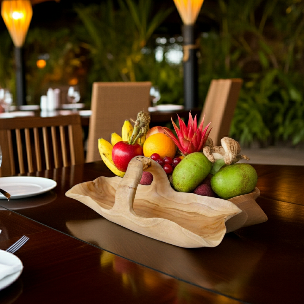Fruteira maciça esculpida à mão com pega. Modelo Mangkuk.