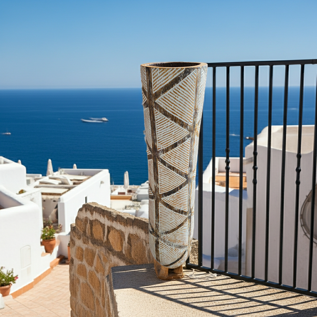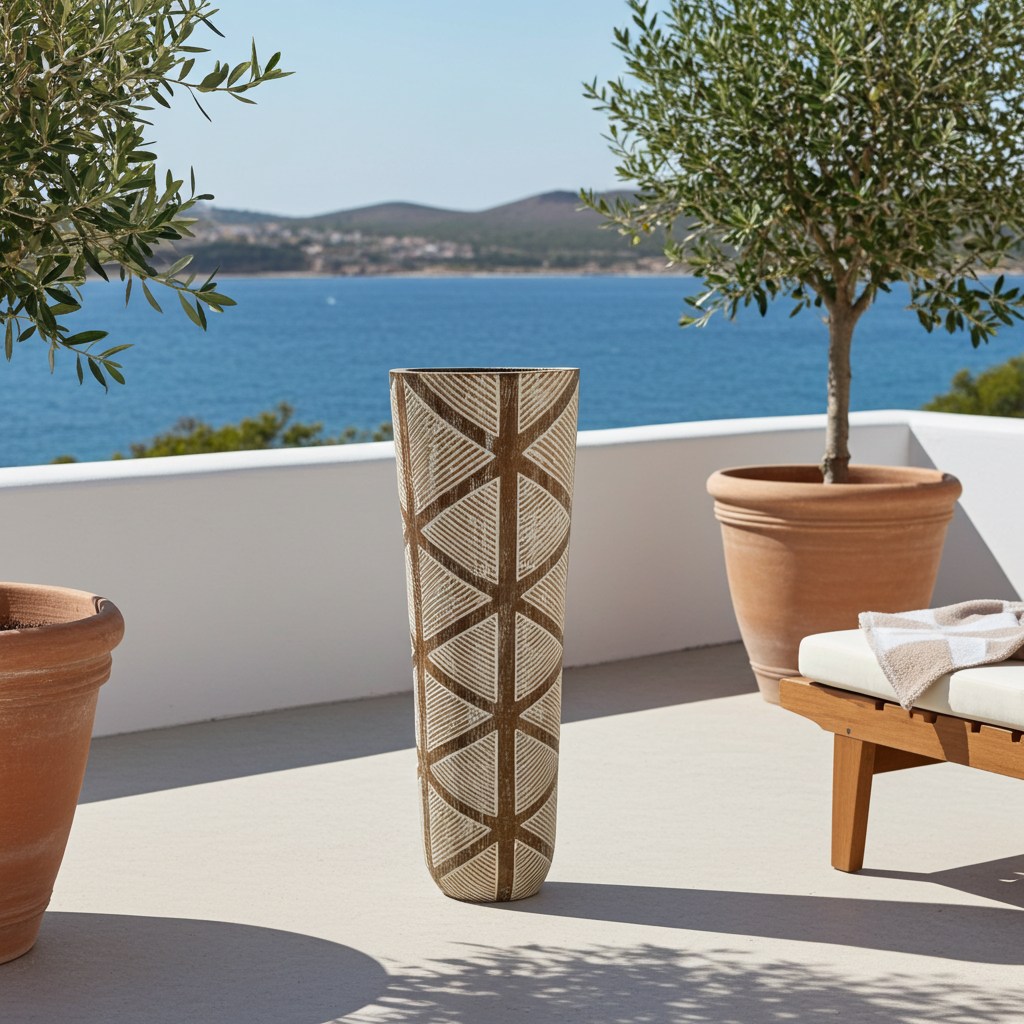 Vaso de chão em madeira com padrões tribais geométricos dourados. Modelo Mojokerto.